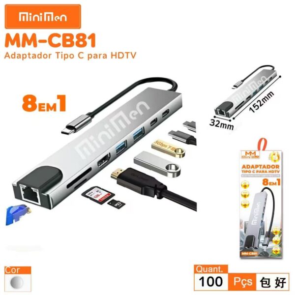 Adaptador 8 in1 Leon MM-CB81 Hdmi Usb Tipo C e Entrada Cartao De Memoria