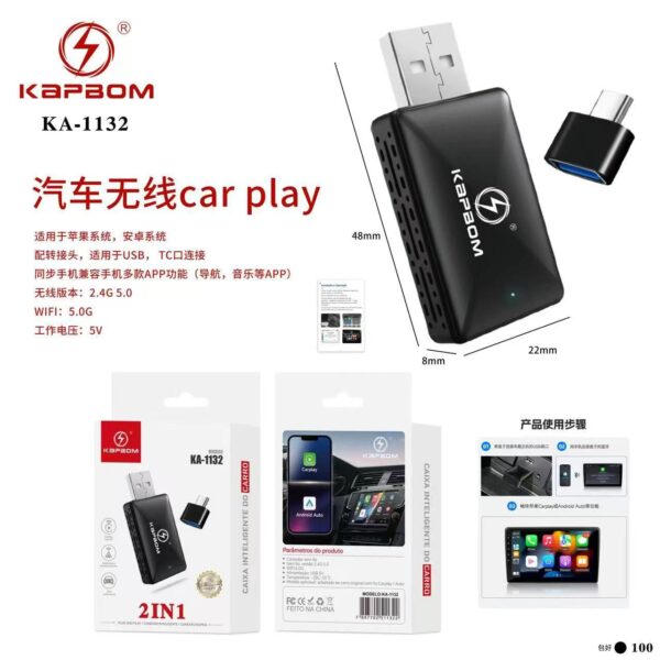 Adaptador Bluetooth Car Play Sem fio 2 IN 1 USB e Otg Tipo C Kapbom KA-1132