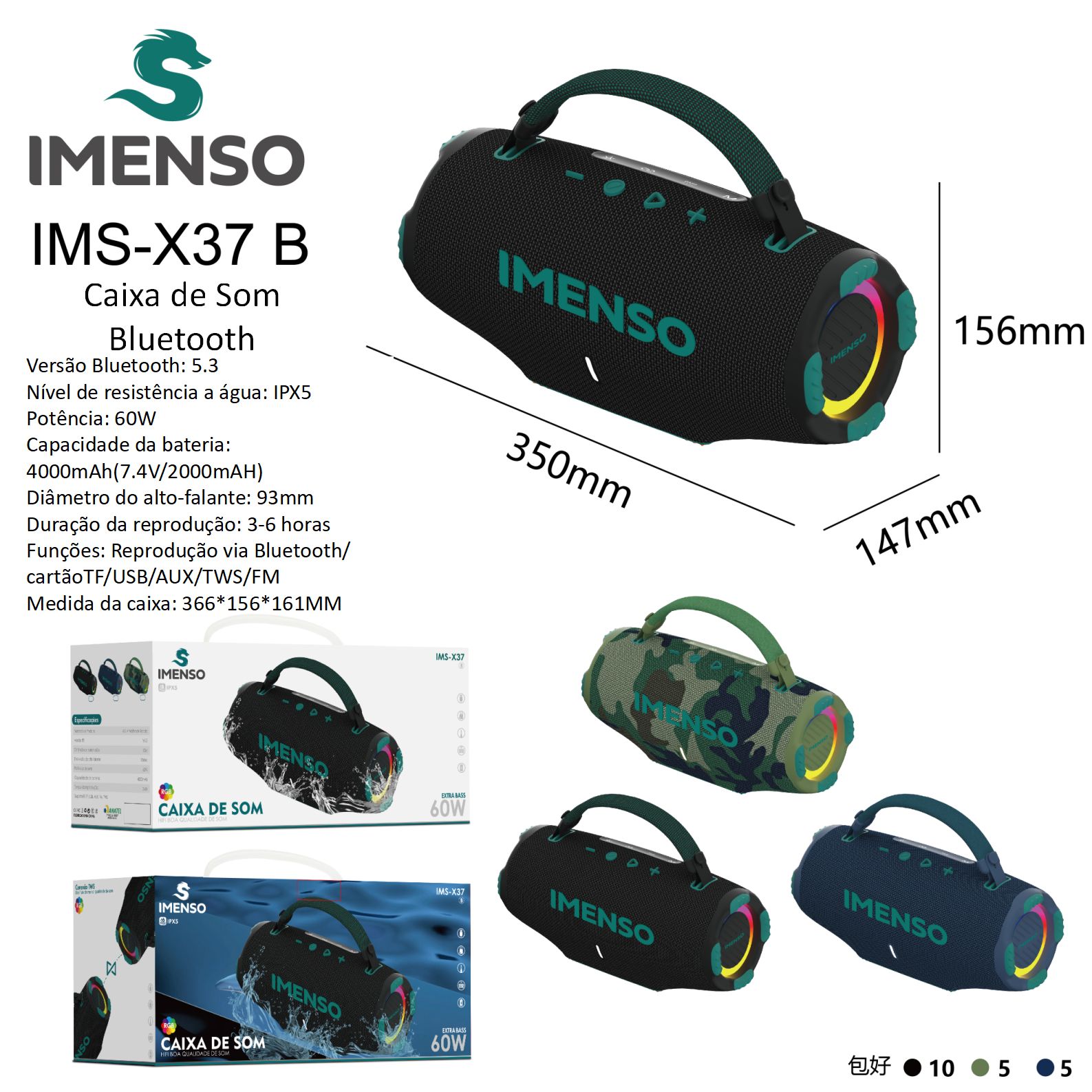 Caixa De Som Bluetooth Imenso IMS-X37 B Resistente Agua 60W